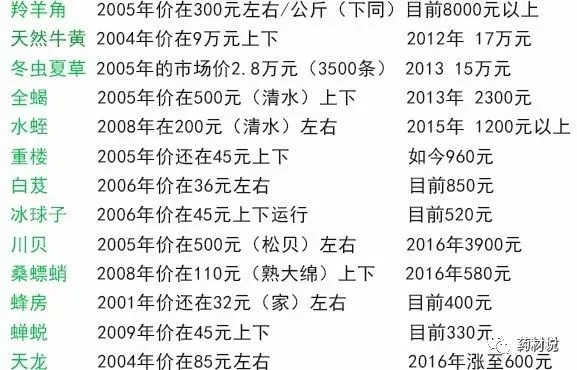 從以上數(shù)據(jù)我們可以看到,有些中藥材在10年左右的時(shí)間,價(jià)格翻了數(shù)十倍,漲幅相當(dāng)驚人。